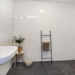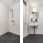De moderne badkamer is geheel betegeld en voorzien van een inloopdouche met thermostaatkraan, wastafel, spiegel en radiator.