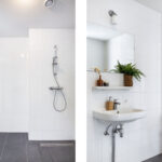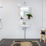 De moderne badkamer is geheel betegeld en voorzien van een inloopdouche met thermostaatkraan, wastafel, spiegel en radiator.