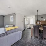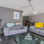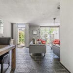 De grote en tuingerichte living heeft een afmeting van circa 33m2, is heerlijk licht door de grote raampartij met schuifdeur en achterdeur en voorzien van een tegelvloer met vloerverwarming en gestucte wanden.