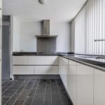 De ruime keuken is aan de voorzijde van de woning gesitueerd en voorzien van een modern en luxe keukenblok in hoekopstelling met apparatenwand. De keuken heeft een granieten aanrechtblad, koelkast, vriezer, 5-pist gaskookplaat, combimagnetron, RVS-afzuigkap, close-in boiler, vaatwasser en veel werk- en kastruimte.