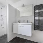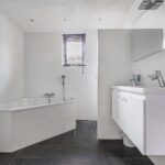 De ruime en modern afgewerkte badkamer is geheel betegeld en voorzien van een groot hoekbad met thermostaatkraan, inloopdouche met regen- en handdouche en thermostaatkraan, badmeubel met twee wastafels, designradiator, hangend closet en gestuct plafond met inbouwverlichting.