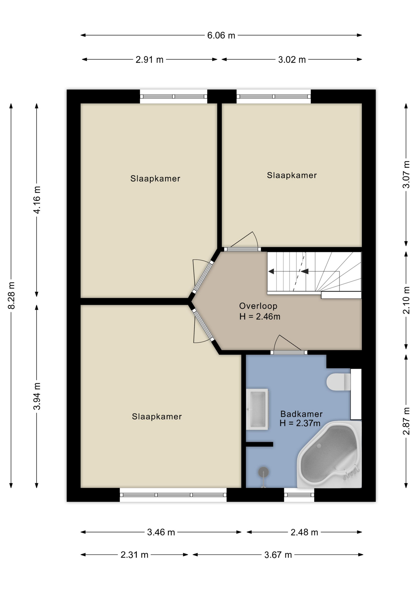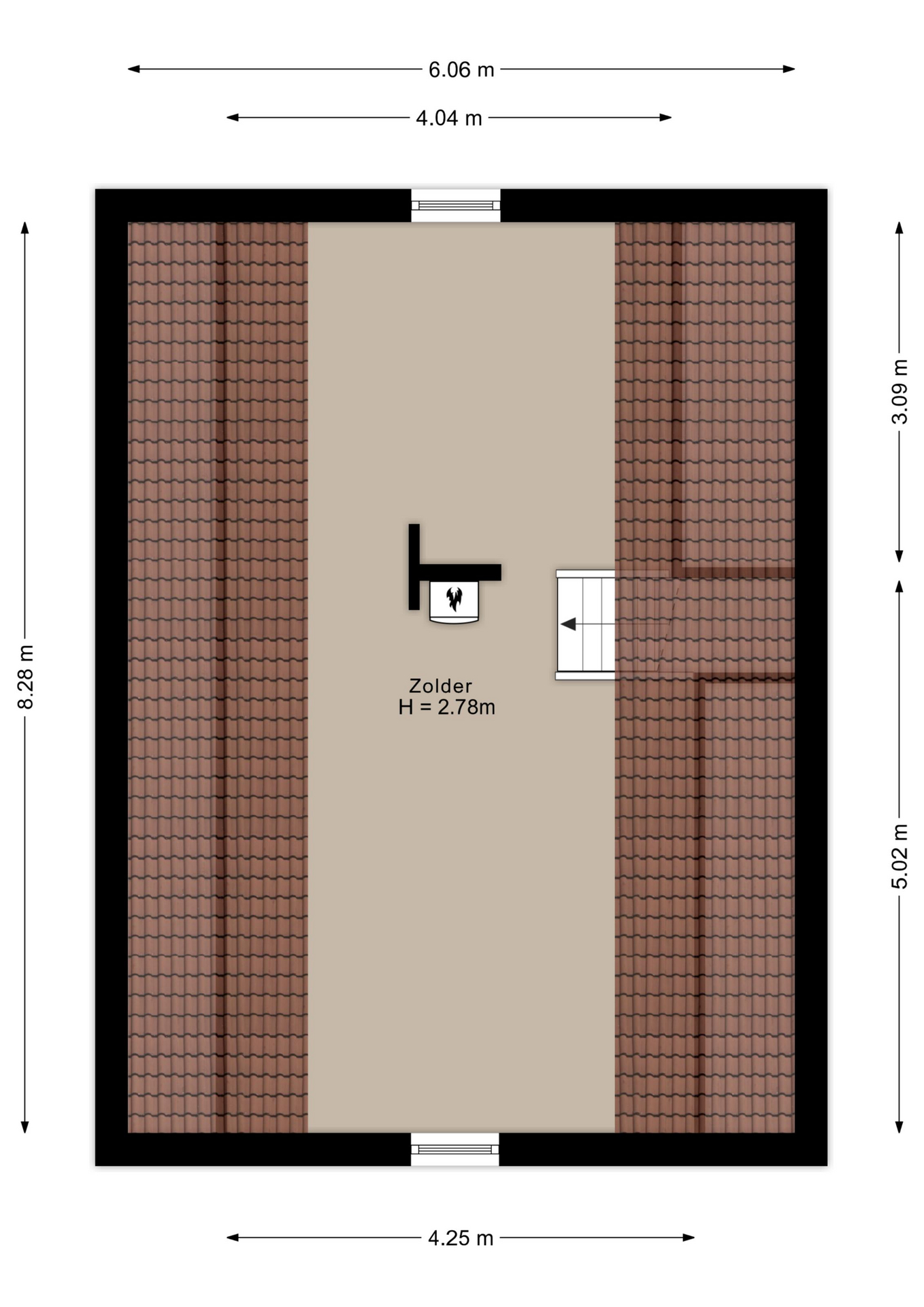 Door de gunstige dwarskap van de woning en de trapopgang in het midden van de ruimte, kun je hier op eenvoudige wijze twee extra slaapkamers realiseren.