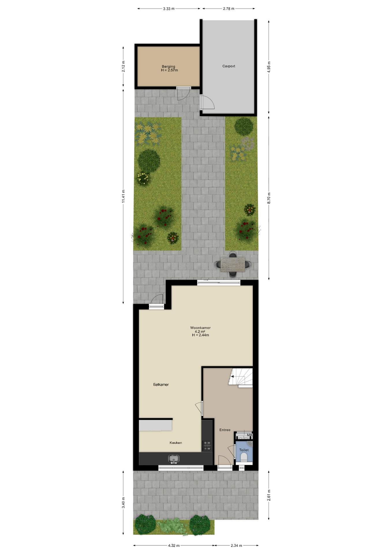 De voortuin is verzorgd aangelegd en grenst aan het rustige en kindvriendelijke woonerf met groot groenperk en speelplaats voor de deur.