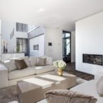 De royale woonkamer is prachtig afgewerkt met een glad plafond met dimbare inbouwspots, houtlook PVC vloer (met vloerverwarming/koeling), home automation systeem bedienbaar op een app en ingebouwde iPad en in het midden een doorkijk openhaard met aan 1 kant een lift deur en aan de andere kant een openslaande deur. Door de diverse hoge raampartijen straalt veel licht naar binnen. De open keuken bevindt zich aan de achterzijde.