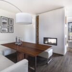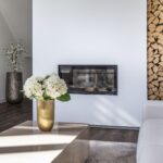 • Royale woonkamer met doorkijk openhaard met aan 1 kant een lift deur en aan de andere kant een openslaande deur
