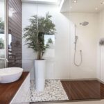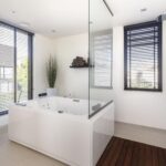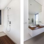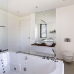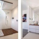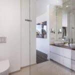 In de luxe, moderne badkamer met waterdichte epoxy wanden heeft u de beschikking over een grote inloop regendouche, dubbel wastafelmeubel met waskommen, zwevend toilet en prachtige lichtkoepel met elektrische verduistering.