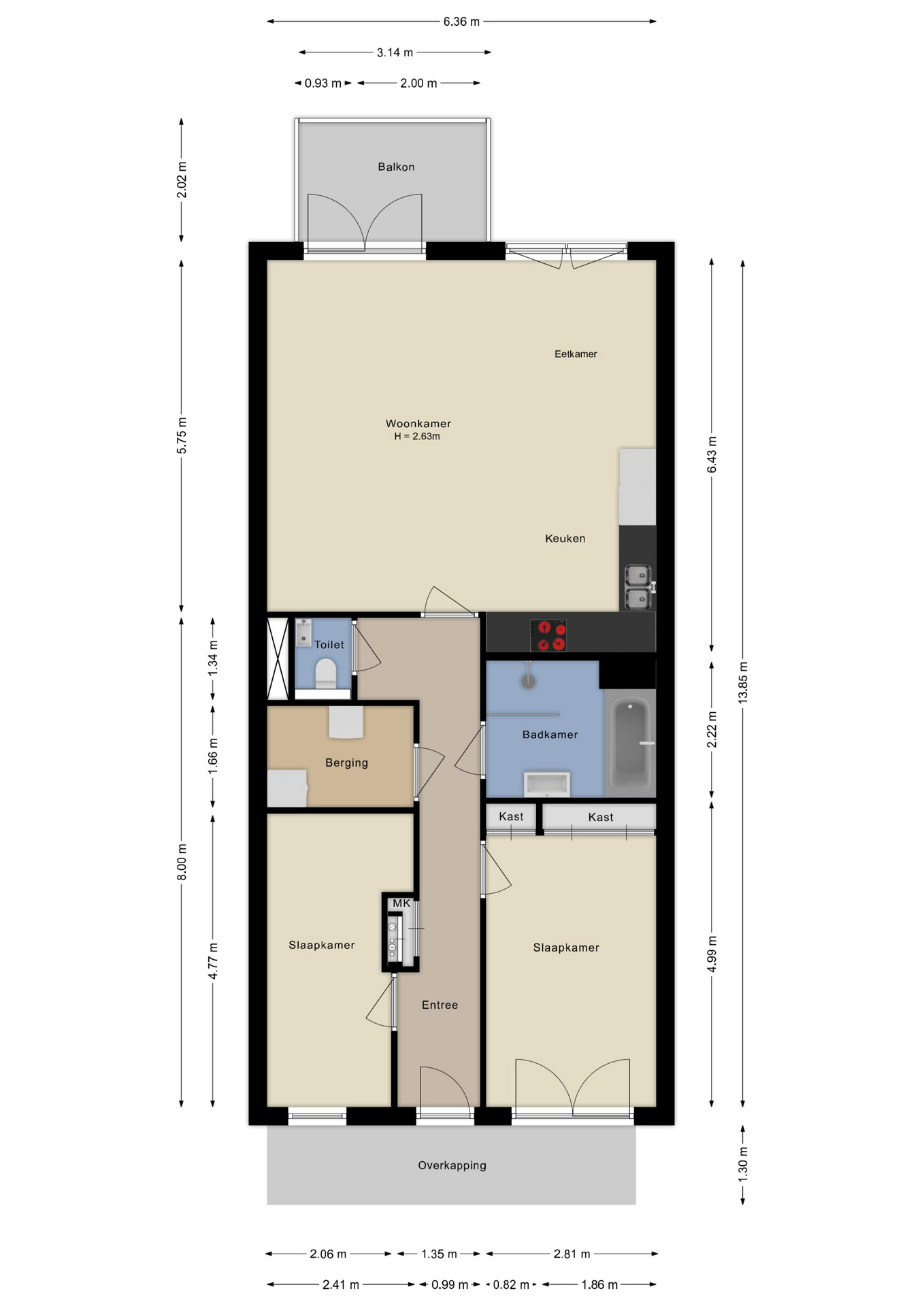 Entree, hal met toegang tot twee slaapkamers, meterkast, separate toiletruimte, badkamer, inpandige berging/wasruimte en de woonkamer met open keuken.