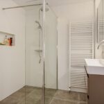 De moderne en strak betegelde badkamer is voorzien van een grote inloopdouche met glazen wanden, thermostaatkraan en regen-/handdouche, breed wastafelmeubel, hangend closet, spiegelkast met verlichting -en elektra, designradiator en glad gestuct plafond.