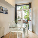 De ruime overloop geeft toegang tot een separaat toilet en de sfeervolle woonkamer. De kamer-en-suite, met de originele glas-in-looddeuren en authentieke vaste kasten, verdeelt de ruimte op een natuurlijke wijze. De woonkamer aan de voorzijde geniet van een prettige lichtinval, mede dankzij de plafondhoogte van ruim 2,70 meter. Aan de achterzijde bevindt zich de eetkamer, die toegang biedt tot het zonnige balkon op het westen. Hier kunt u in alle rust en privacy van de middag- en avondzon genieten, met een vrij uitzicht over de binnentuinen. De keuken bevindt zich aan de voorzijde en is voorzien van een modern keukenblok met een energiezuinige inductiekookplaat en spoelbak.