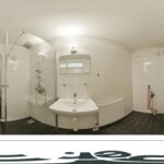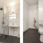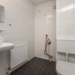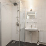 - Badkamer met douchecabine, toilet, wastafel en wasmachineaansluiting.