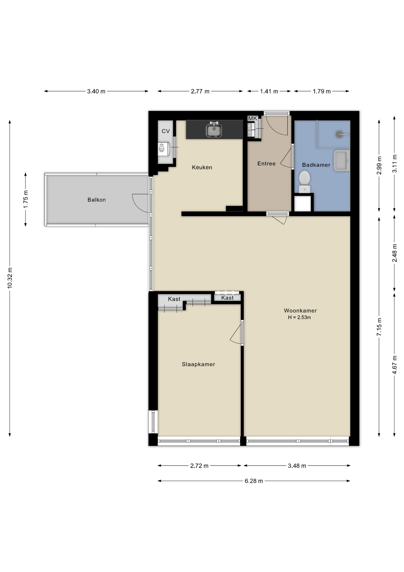 Via de entree kom je in de hal met toegang tot de meterkast. Vanuit hier bereik je de verschillende vertrekken. De badkamer is grotendeels betegeld en voorzien van een douchecabine, toilet, wastafel en wasmachineaansluiting. Ook is er mechanische ventilatie aanwezig. De woonkamer is licht en sluit aan op het eetgedeelte met een praktische vaste kast. De halfopen keuken is eenvoudig uitgevoerd met een keukenblok en eveneens een vaste kast. Hier bevindt zich ook de cv-kast met de Remeha Tzerra cv-ketel. Vanuit de keuken is er toegang tot het balkon, gelegen op het noordwesten aan de straatzijde. De slaapkamer beschikt over een handbediend zonnescherm en drie vaste kasten, die desgewenst eenvoudig te verwijderen zijn.