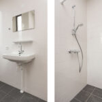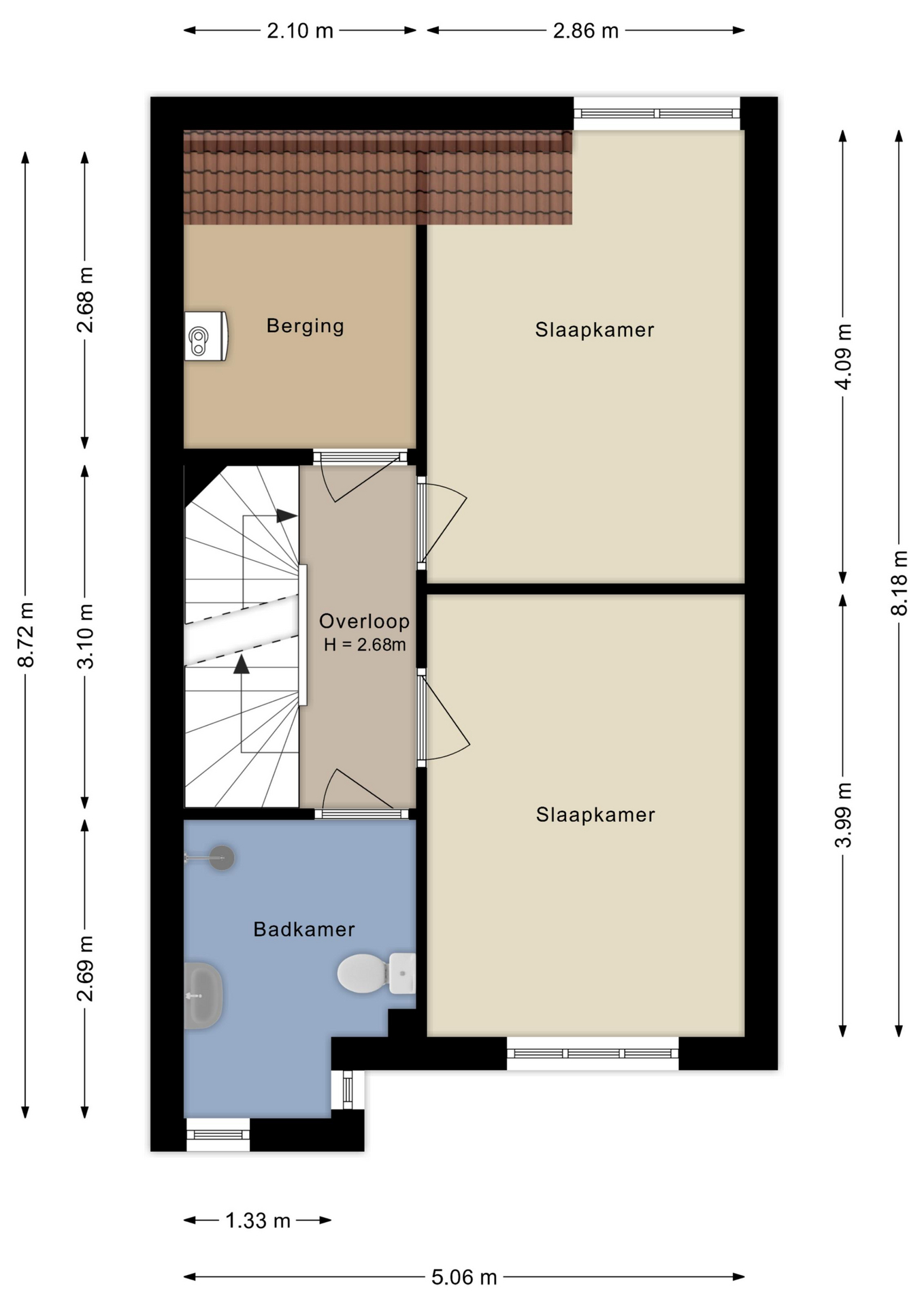 Op deze verdieping bevinden zich twee goed bemeten slaapkamers, één aan de voorzijde en één aan de achterzijde, waarbij de achterkamer extra ruimte heeft dankzij de dakkapel. De badkamer is volledig betegeld en beschikt over een douche, wastafel, tweede toilet en een raam voor natuurlijke ventilatie. Daarnaast is er een royale inpandige bergruimte met plaats voor de cv-ketel, wasmachine en overige technische installaties.