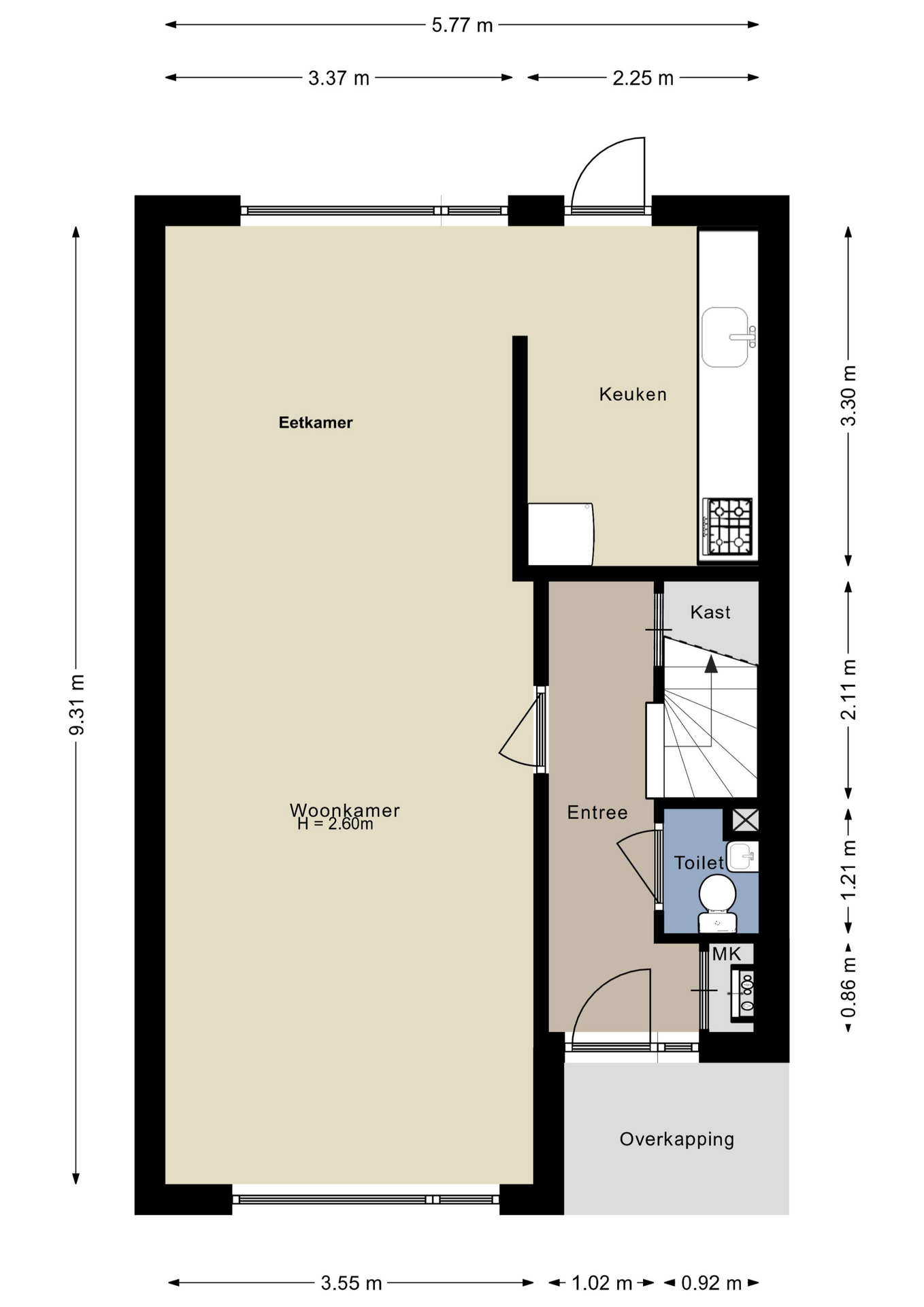 Overdekte entree, hal, toiletruimte, meterkast, praktische trapkast en trapopgang.