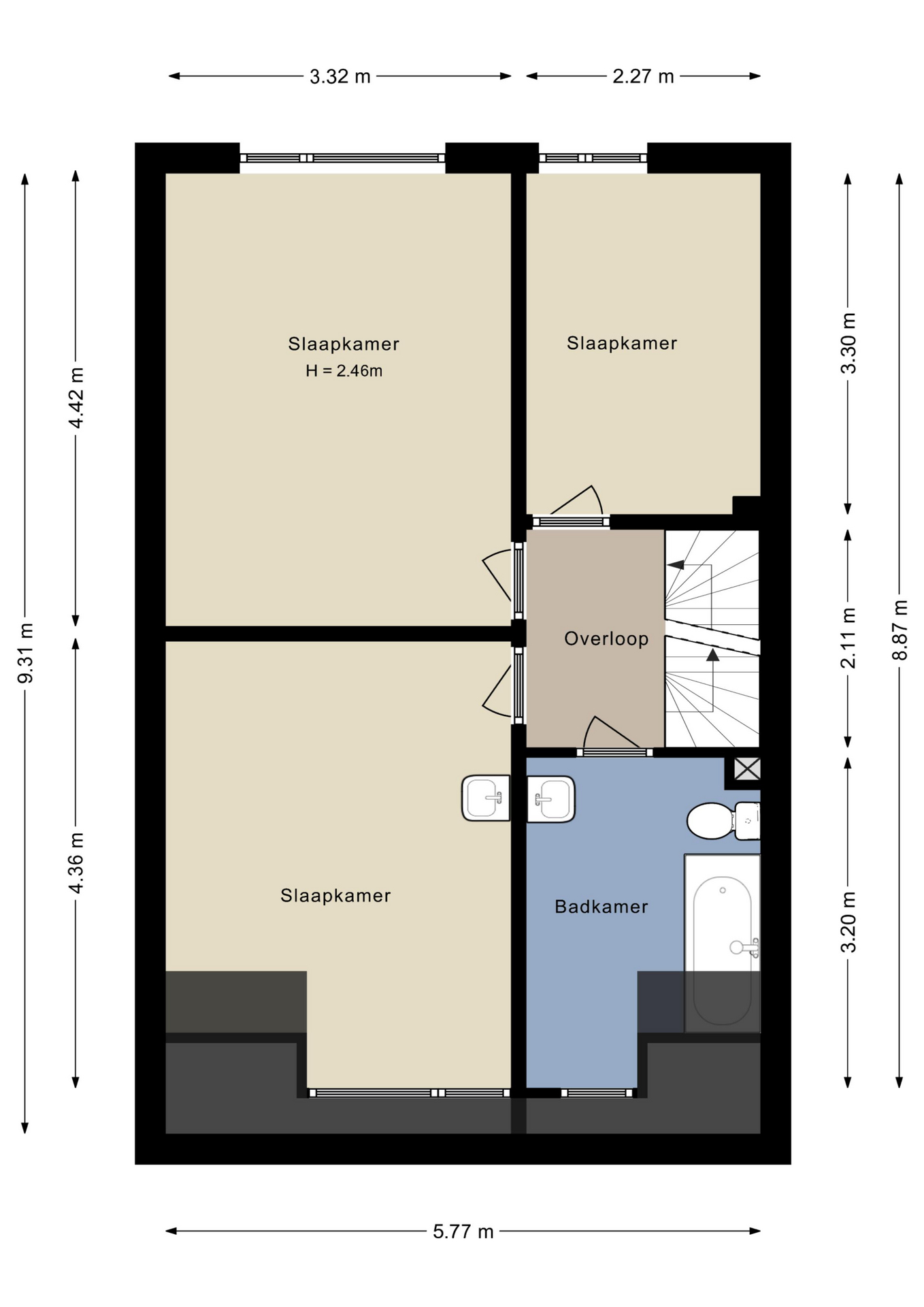 Overloop met toegang tot drie ruime slaapkamers. De slaapkamer aan de voorzijde is tevens voorzien van een dakkapel en wastafel.