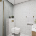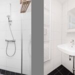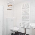 De badkamer is betegeld met een moderne tegel en voorzien van een inloop douche, vaste wastafel, toilet en de witgoedaansluitingen.