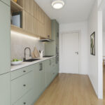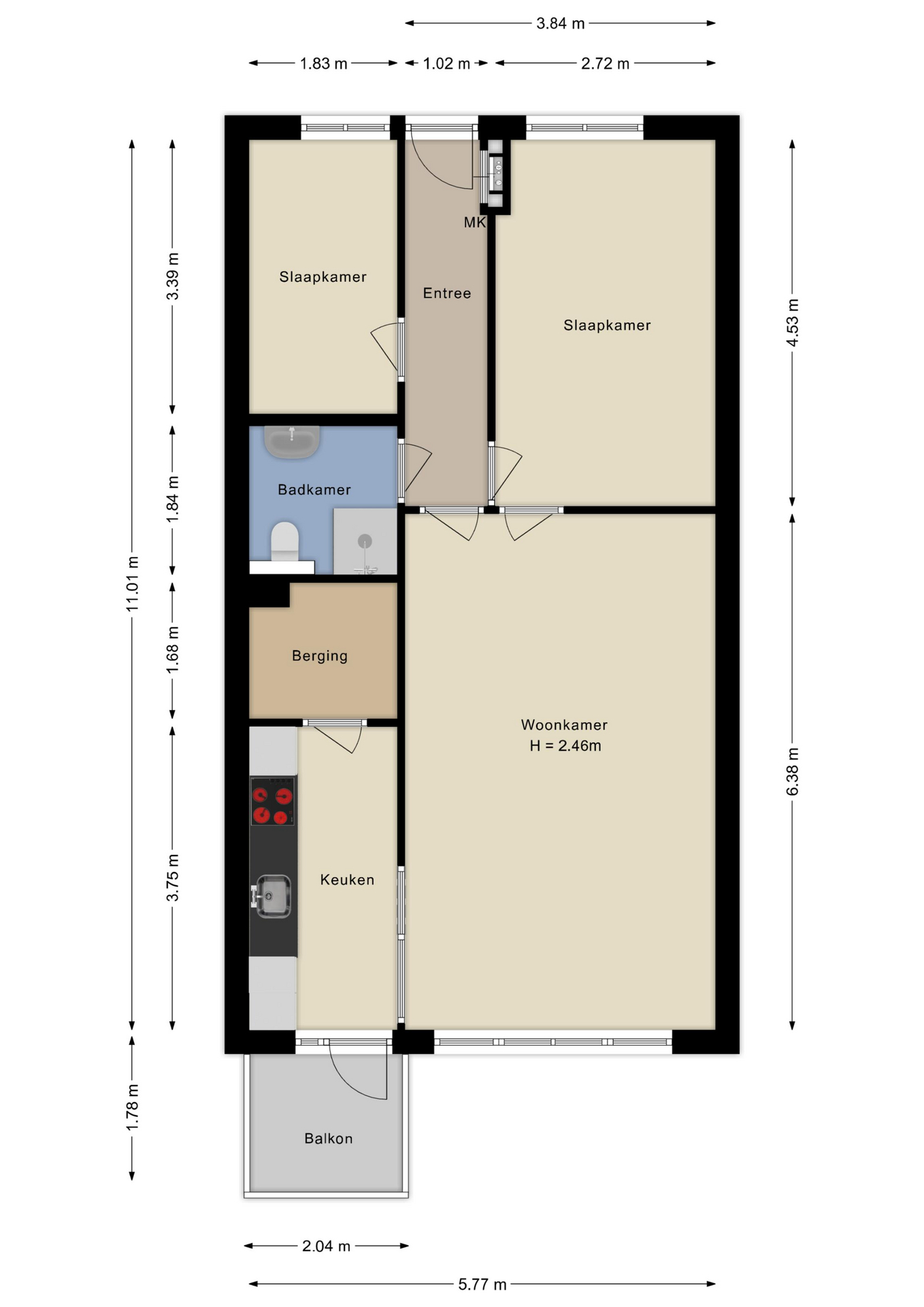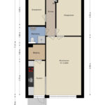 Eigen entree, hal met meterkast en toegang naar de keuken en de woonkamer. De woonkamer en keuken zijn aan de terraszijde gelegen. In de keuken is ook de CV-ketel opgehangen.