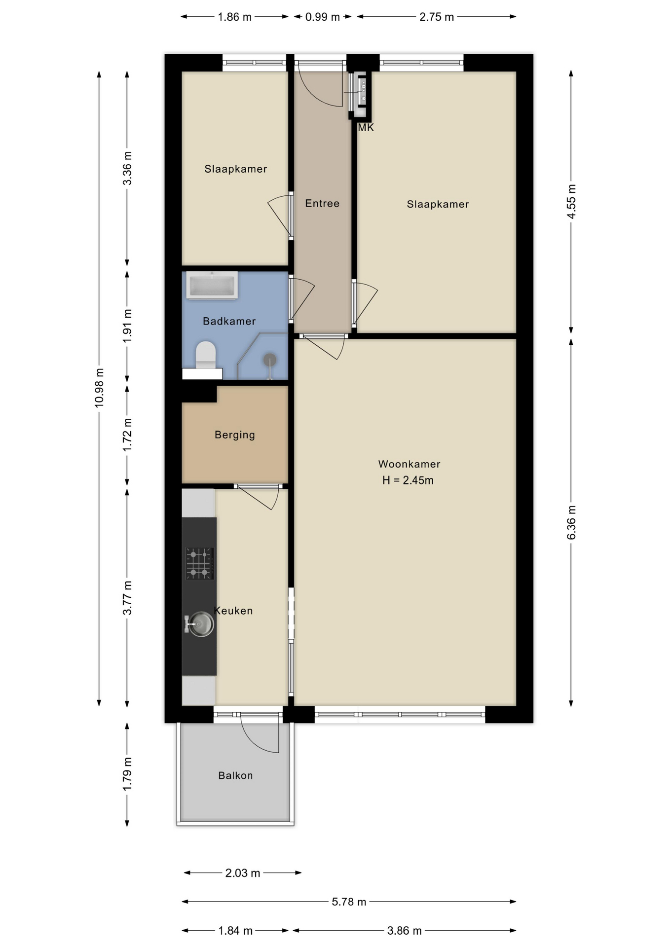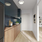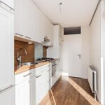 Eigen entree, hal met meterkast en toegang naar de keuken en de woonkamer. De woonkamer en keuken zijn aan de terraszijde gelegen. In de keuken is ook de CV-ketel opgehangen.