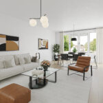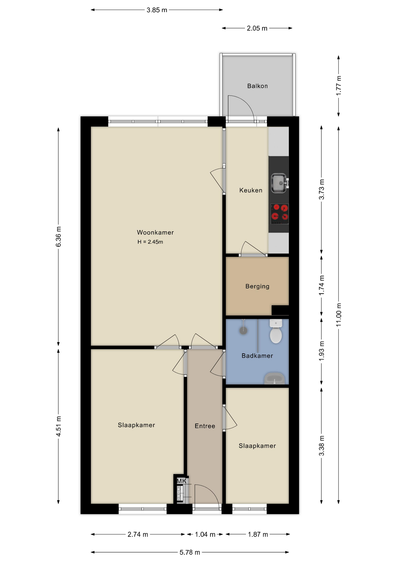 Eigen entree, hal met meterkast en toegang naar de keuken en de woonkamer. De woonkamer en keuken zijn aan de terraszijde gelegen. In de keuken is ook de CV-ketel opgehangen.