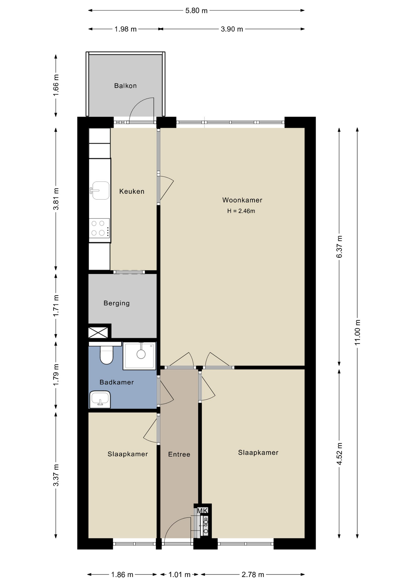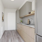 Eigen entree, hal met meterkast en toegang naar de keuken en de woonkamer. De woonkamer en keuken zijn aan de terraszijde gelegen. In de keuken is ook de CV-ketel opgehangen.