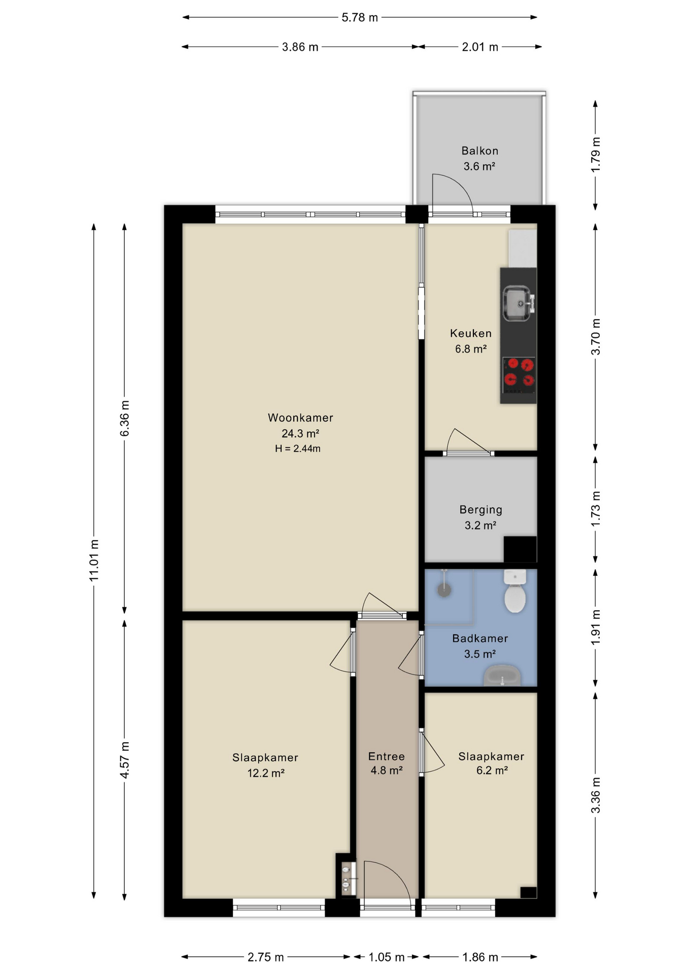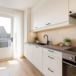 Eigen entree, hal met meterkast en toegang naar de keuken en de woonkamer. De woonkamer en keuken zijn aan de terraszijde gelegen. In de keuken is ook de CV-ketel opgehangen.
