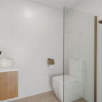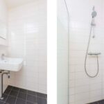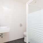 De badkamer is betegeld met een moderne tegel en voorzien van een douchecabine, vaste wastafel en toilet.