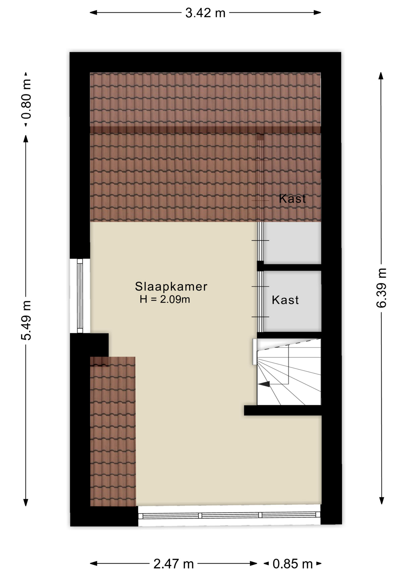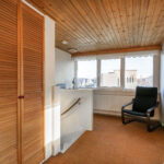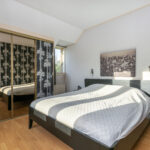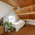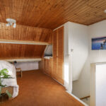 Middels een vaste trap kom je op de tweede verdieping. Deze biedt een verrassend ruime slaapkamer met een speelse indeling. Dankzij de schuine kap en de slimme plaatsing van meerdere vaste kasten is de ruimte optimaal benut. Deze verdieping is ideaal te gebruiken als tweede slaap-/logeerkamer, rustige werkplek of hobbykamer.