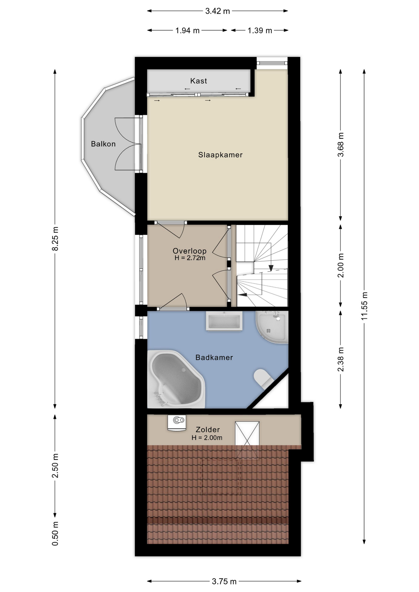 Centraal op de eerste verdieping ligt de overloop met toegang tot de slaapkamer en de riante badkamer. De slaapkamer is ruim van formaat en biedt een directe toegang tot het charmante balkon, een heerlijke zonnige plek. De vaste kastenwand zorgt voor volop bergruimte zonder in te leveren op leefruimte. De ruime badkamer is compleet uitgevoerd met ligbad, douche, wastafel en toilet en heeft een prettige, functionele indeling.