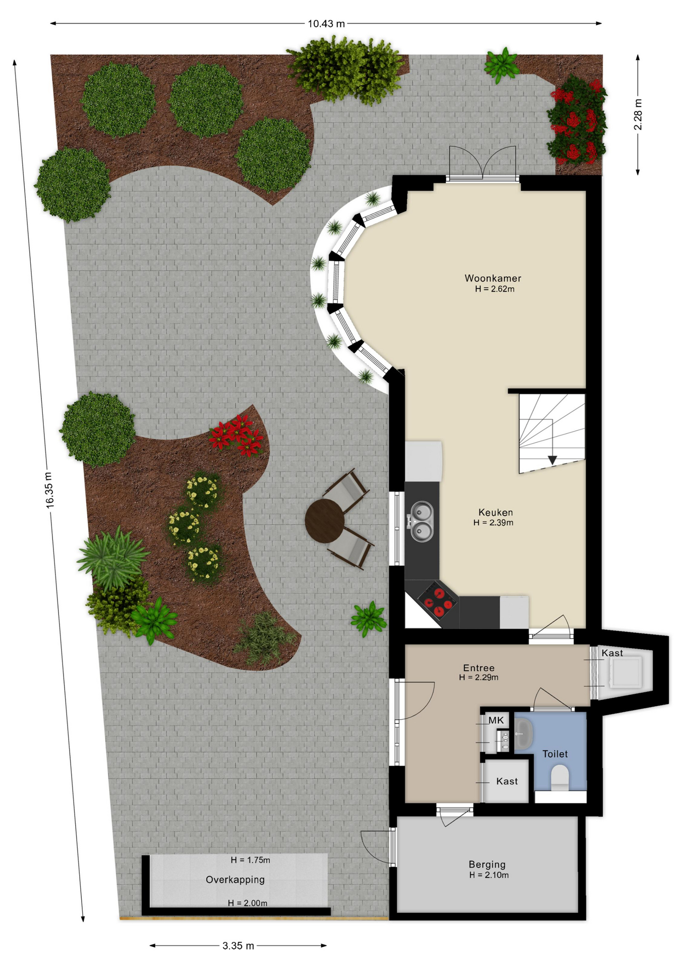 De begane grond verrast met een speelse en ruimtelijke indeling. Via de entree met garderobe en toilet betreed je de woning, waar direct de prettige lichtinval opvalt. Aan de voorzijde bevindt zich de keuken, praktisch opgesteld en in open verbinding met de woonkamer. De lichte woonkamer is een echte blikvanger dankzij de karakteristieke erker met meerdere ramen, wat zorgt voor een sfeervolle uitstraling en veel natuurlijk licht. Daarnaast zijn er dubbele openslaande deuren aanwezig naar de voortuin. In de woonkamer is voldoende ruimte voor een comfortabele zithoek. Aan de achterzijde van de woning bevindt zich een berging met eigen toegang, ideaal voor fietsen en opslag. De zonnige tuin op het zuiden is voorzien van mooie groene borders en fraaie bestrating.