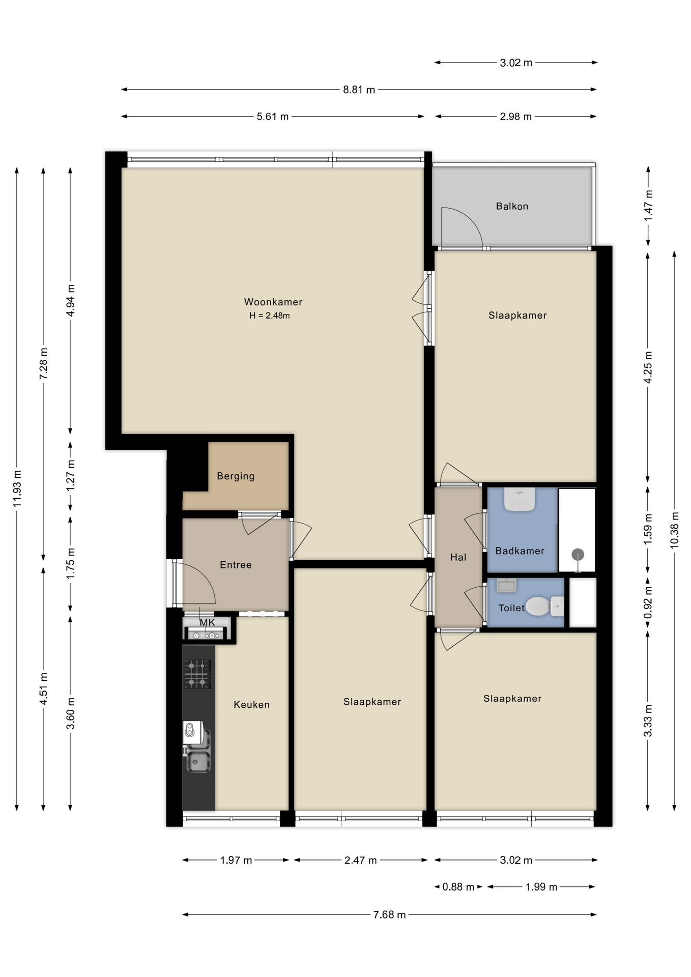 Ruime hal/entree met berging en meterkast. Vanuit de hal kom je in de ruime, dichte keuken en in de woonkamer. De riante woonkamer is voorzien van grote raampartijen waardoor deze heerlijk licht is. Via een tussenhal zijn de drie slaapkamers, het toilet en de badkamer te bereiken. De slaapkamer aan de achterzijde is heerlijk ruim en biedt toegang tot het zonnige balkon gelegen op het zuidoosten. De badkamer is voorzien van een ligbad, wastafel en wasmachineaansluiting.