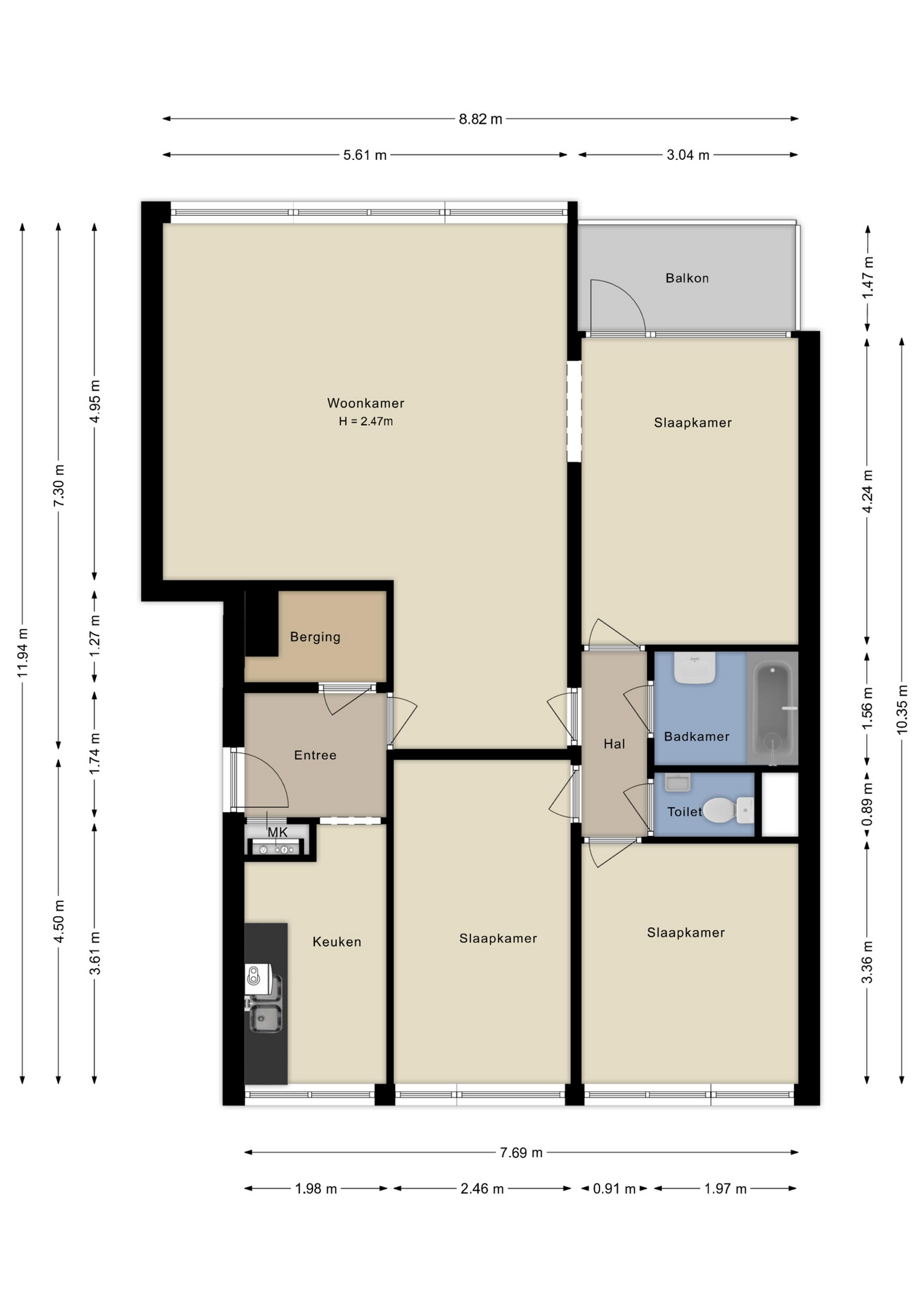 Ruime hal/entree met berging en meterkast. Vanuit de hal kom je in de ruime, dichte keuken en in de woonkamer. De riante woonkamer is voorzien van grote raampartijen waardoor deze heerlijk licht is. Via een tussenhal zijn de drie slaapkamers, het toilet en de badkamer te bereiken. De slaapkamer aan de achterzijde is heerlijk ruim en biedt toegang tot het zonnige balkon gelegen op het zuidoosten. De badkamer is voorzien van een ligbad, wastafel en wasmachineaansluiting.