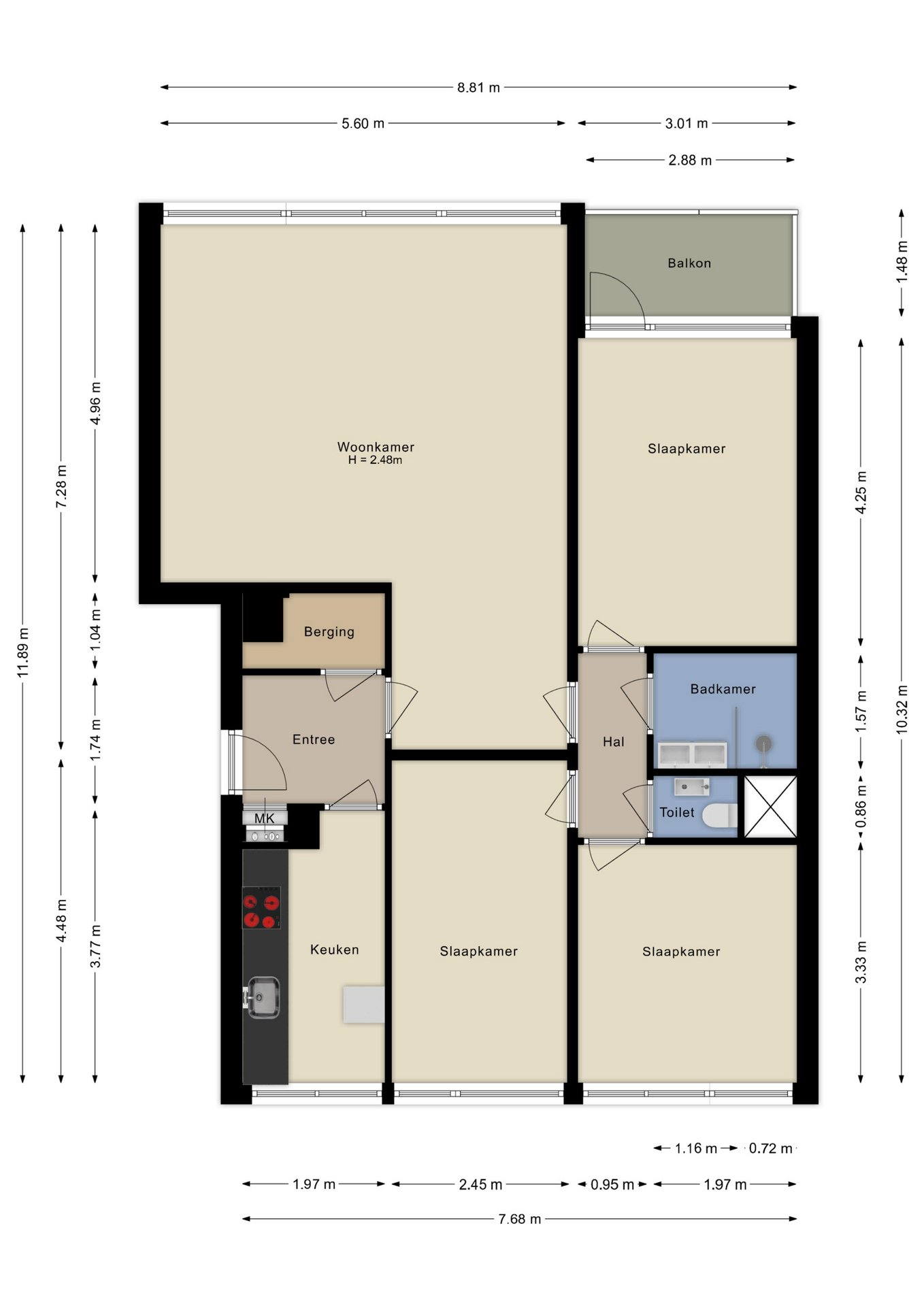 Hal/entree, praktische inpandige berging met wasmachineaansluiting en meterkast. Ruime, dichte keuken voorzien van een 4-pits inductiekookplaat, afzuigkap, koel-vriescombinatie, oven en vaatwasser. Royale woonkamer, voorzien van grote raampartijen, waardoor deze heerlijk licht is. De hoofdslaapkamer is heerlijk ruim en biedt toegang tot het zonnige balkon gelegen op het zuidoosten. Daarnaast zijn er nog 2 slaapkamers, apart toilet en een badkamer met inloopdouche en wastafelmeubel.