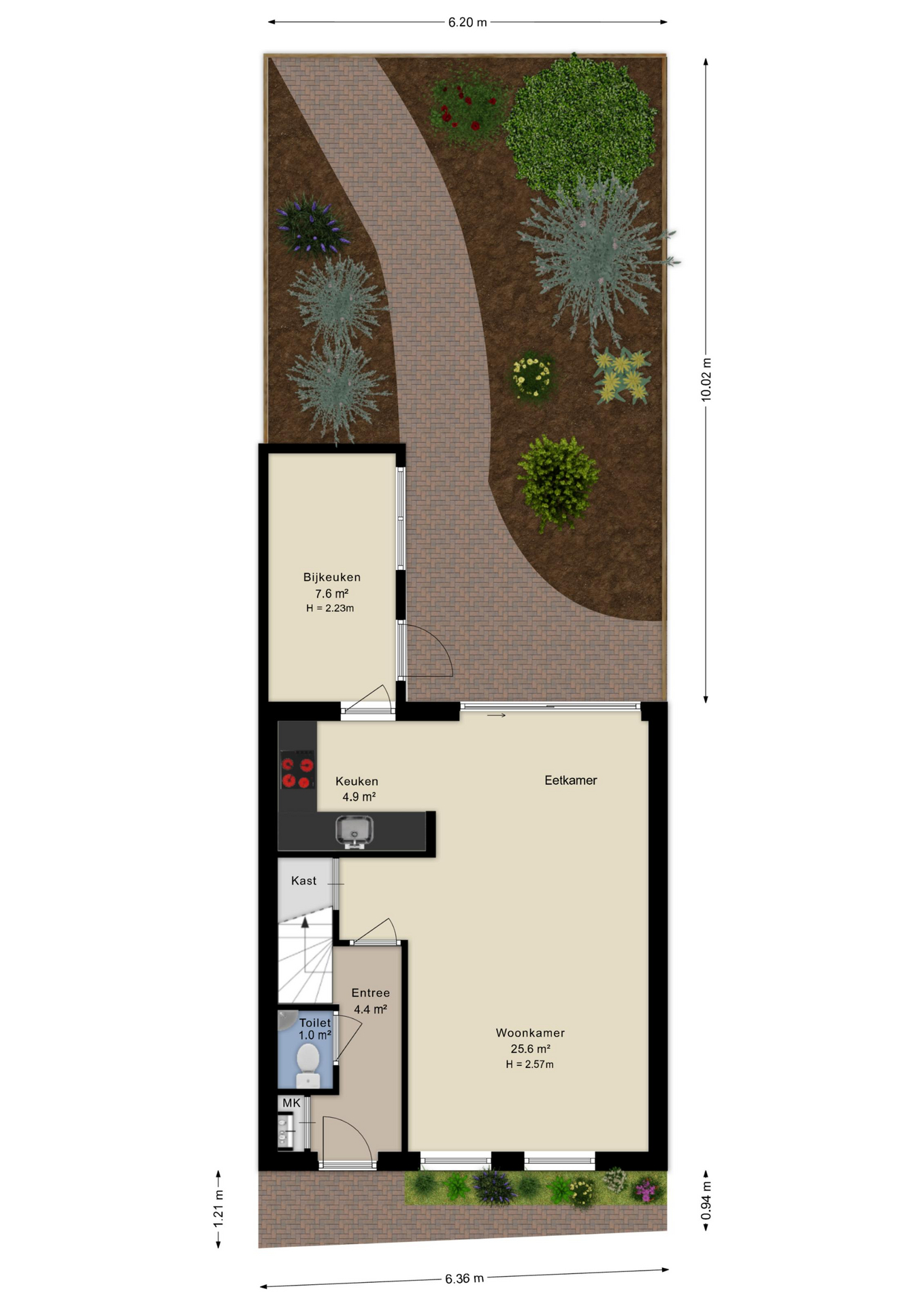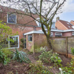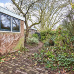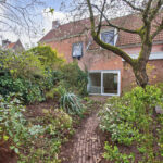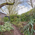 - Diepe achtertuin met stenen berging en achterom.