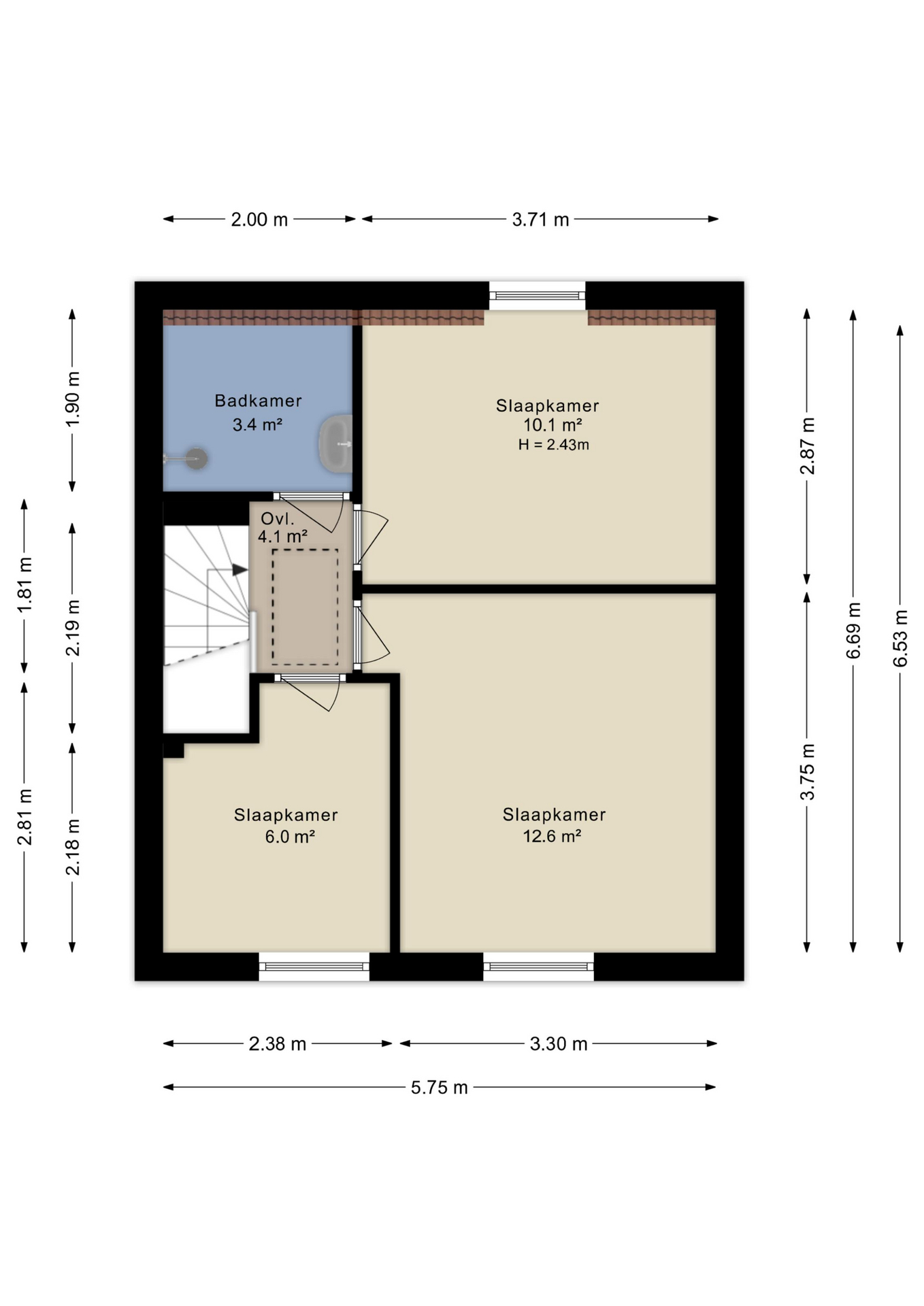 Overloop met toegang tot alle vertrekken. Aan de voorzijde van de woning bevinden zich twee slaapkamers. Aan de achterzijde is de derde slaapkamer gelegen, welke is voorzien van een dakkapel. De badkamer is uitgerust met een wastafel, douche en wasmachineaansluiting.