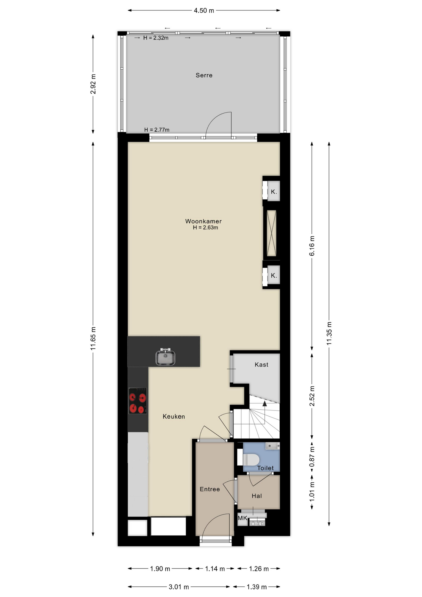 Via de entree kom je binnen in de hal met toegang tot het toilet, de meterkast en de trapopgang.