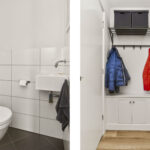 Entree, hal met pvc vloer, gestucte wanden, meterkast, moderne toiletruimte met closet en fonteintje.