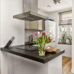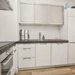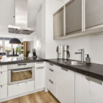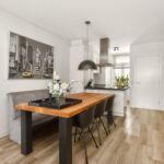 De hoogglans witte keuken is voorzien van een modern keukenblok en kookeiland met koel-/vriescombinatie, kookplaat, oven, RVS-afzuigkap en vaatwasser.