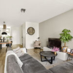 De woonkamer is ruim van afmeting en heerlijk licht door de grote raampartijen en openslaande deuren naar de achtertuin. De woonkamer is voorzien van een fraaie pvc vloer, gestucte wanden en trapkast.