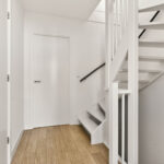 Overloop met laminaatvloer en gestucte wanden en trapopgang naar de tweede verdieping.