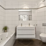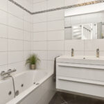 De moderne badkamer is geheel betegeld en voorzien van vloerverwarming, ligbad, douchecabine, toilet en dubbele wastafel.