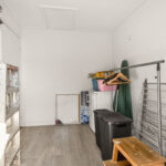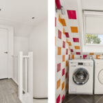 Overloop met laminaatvloer, gestucte wanden en berging met wasmachine aansluiting.