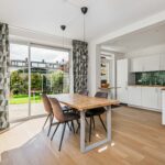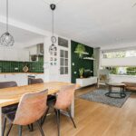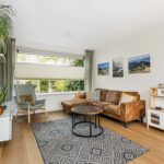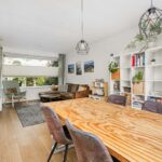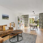 Ruime hal met toilet, meterkast en trapopgang. De lichte woonkamer met aangrenzende eetkamer en open keuken vormt een sfeervolle leefruimte met veel natuurlijk licht. De keuken is vernieuwd (2020) en voorzien van moderne apparatuur, waaronder een Quooker kraan. Via de keuken loop je de verzorgde achtertuin in met achterom en een ruime stenen garage (19 m²) — ideaal voor fietsen, opslag of elektrisch laden dankzij de laadpaal.