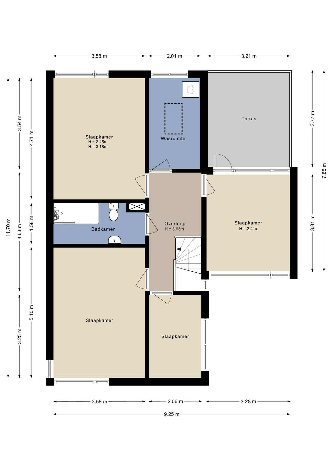 De ruime, lichte overloop vormt een uitnodigende entree tot het huis en biedt toegang tot vijf comfortabele slaapkamers, waarvan er momenteel één dienst doet als praktische was-/cv-/opslagruimte. De nette badkamer is een oase van rust, uitgerust met een douche, ligbad, een stijlvolle wastafel en een tweede toilet, waardoor het comfort voor het hele gezin gewaarborgd is. Een van de slaapkamers beschikt bovendien over een eigen dakterras, ideaal voor ontspanning of om te genieten van de buitenlucht in alle privacy. Dit woningaanbod combineert functionaliteit met een prettige woonomgeving en biedt volop mogelijkheden voor gezinsleven en ontspanning. De eerste verdieping is voorzien van vloerbedekking en een nette wandafwerking.