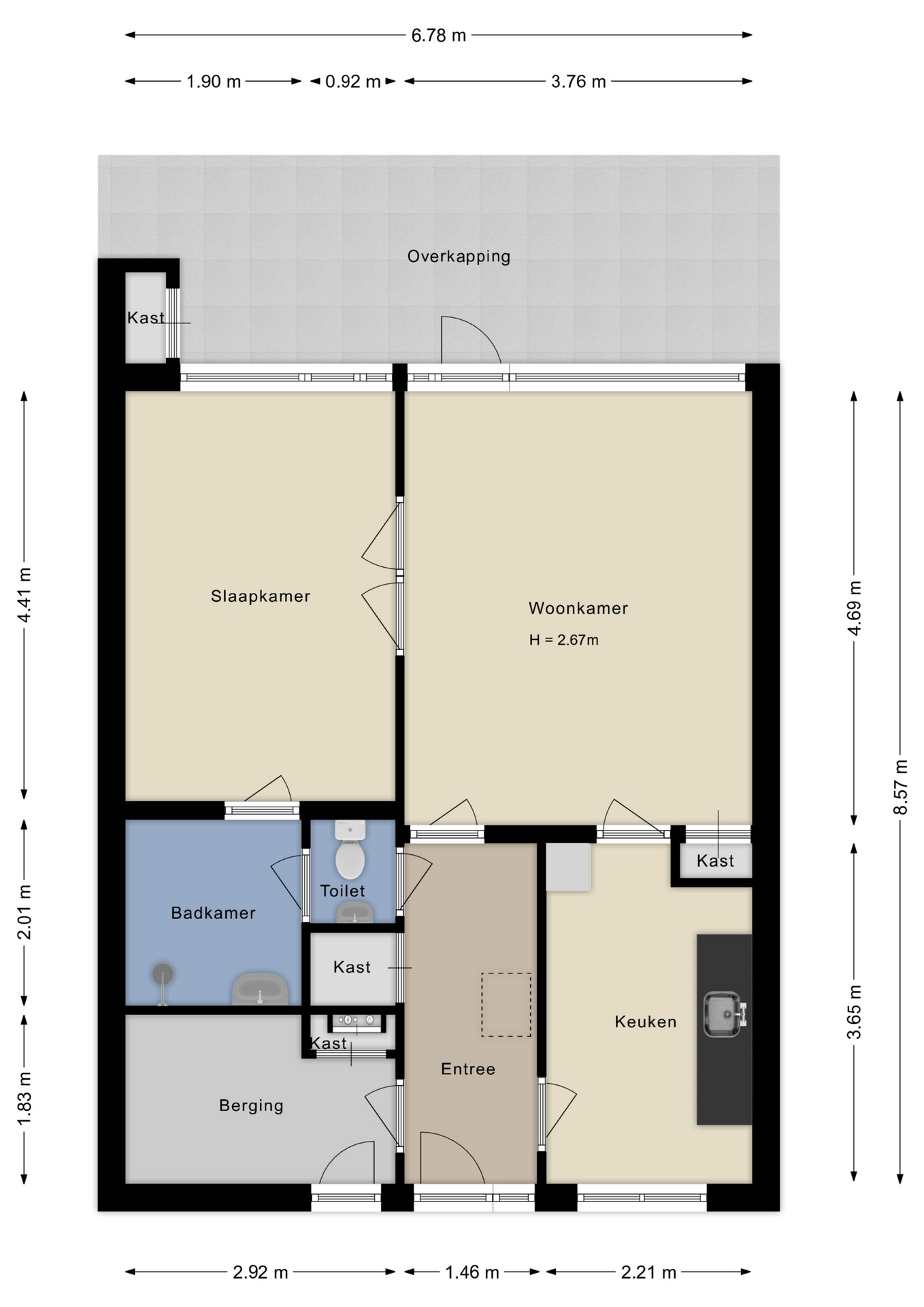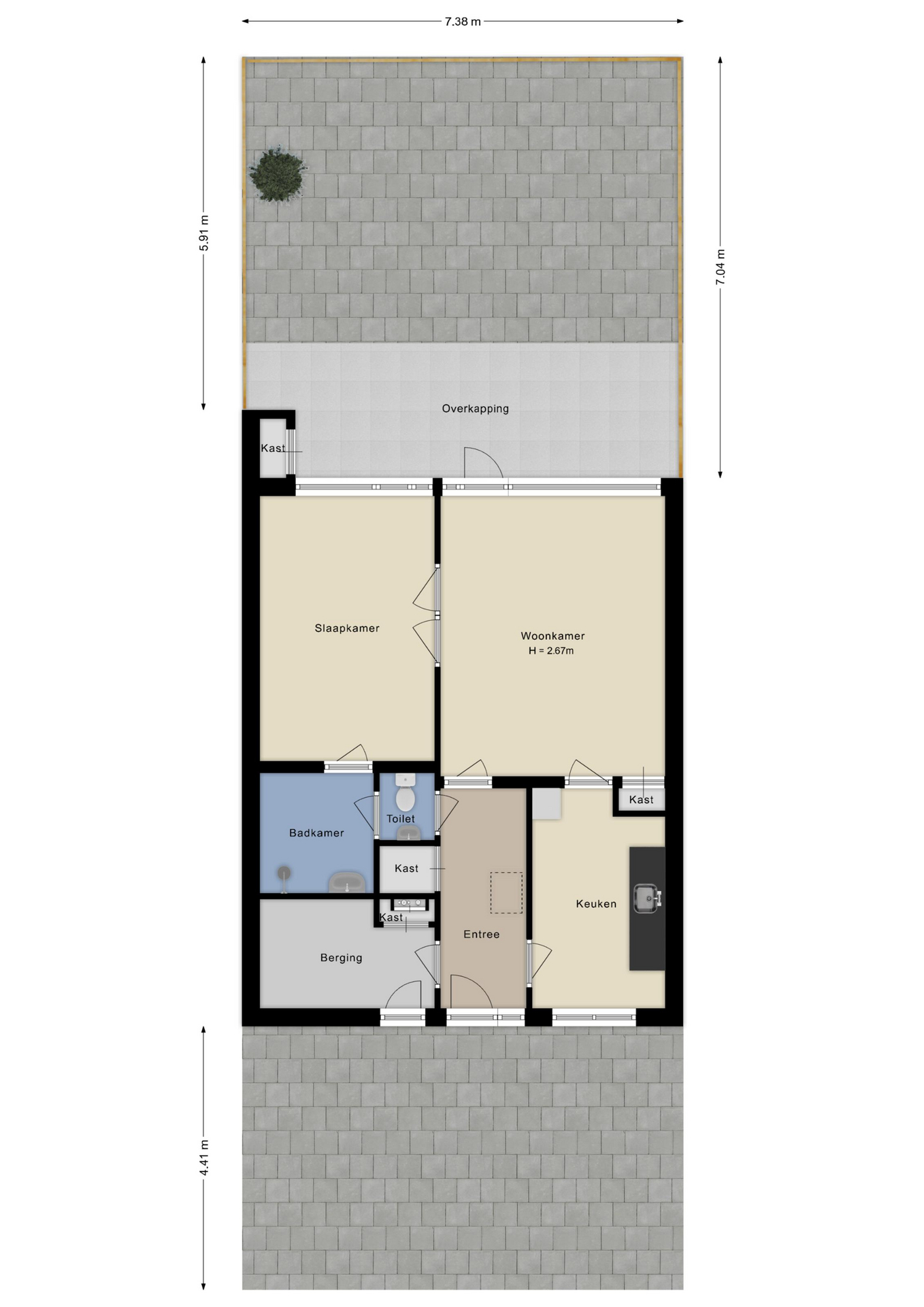 Entree/hal met toegang tot een inpandige berging met meterkast, bereikbaar via zowel binnen als een aparte buitendeur. Daarnaast een handige bergkast en een separaat toilet met fonteintje. De dichte keuken ligt aan de voorzijde van de woning en is voorzien van een eenvoudig keukenblok in drie delen met vier bovenkasten. Via de keuken bereik je de woonkamer met grote raampartij en toegang tot de achtertuin. Dubbele deuren leiden naar de ruime slaapkamer, die aansluit op de badkamer. De badkamer is deels betegeld en voorzien van een douchehoek, wastafel en wasmachineaansluiting. Het aparte toilet is ook via de badkamer toegankelijk.