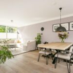 De living is zeer ruim van afmeting en heerlijk licht door de grote raampartijen in de voor- en achtergevel. De kamer is stijlvol afgewerkt met brede eikenhouten vloerdelen, glad gestucte wanden -en plafond met sierlijsten en strakke radiatorombouw en is daarnaast voorzien van een airconditioning en sunscreen.