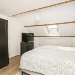 Via een vaste trap is 2e verdieping bereikbaar, die is verdeeld in een grote zolderkamer en een ruime voorzolder met PVC-vloer en glad gestucte wanden -en plafond, Velux-dakraam, CV-opstelling, badmeubel met wastafel, omvormer van de 8 zonnepanelen en bergruimte achter de knieschotten.