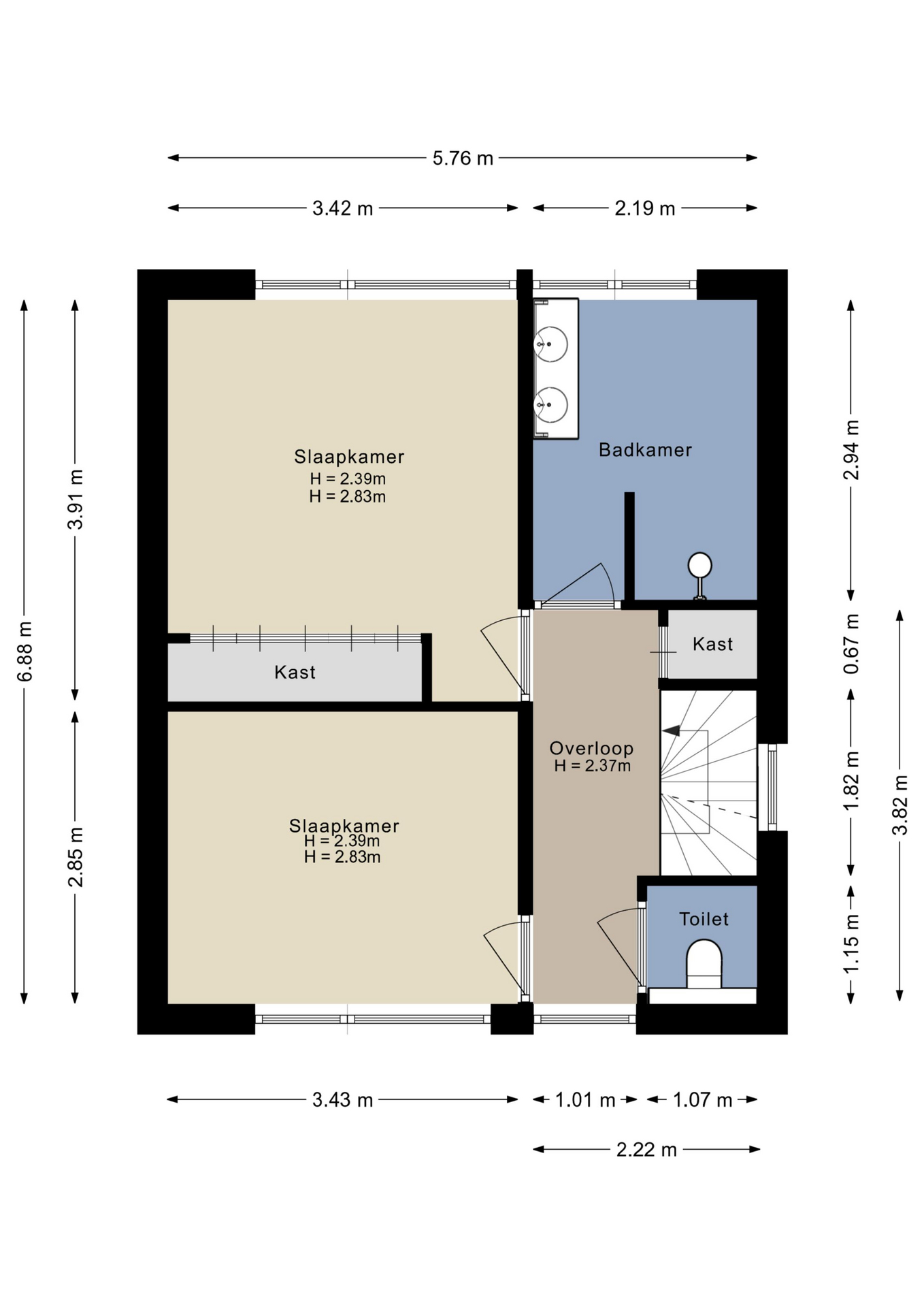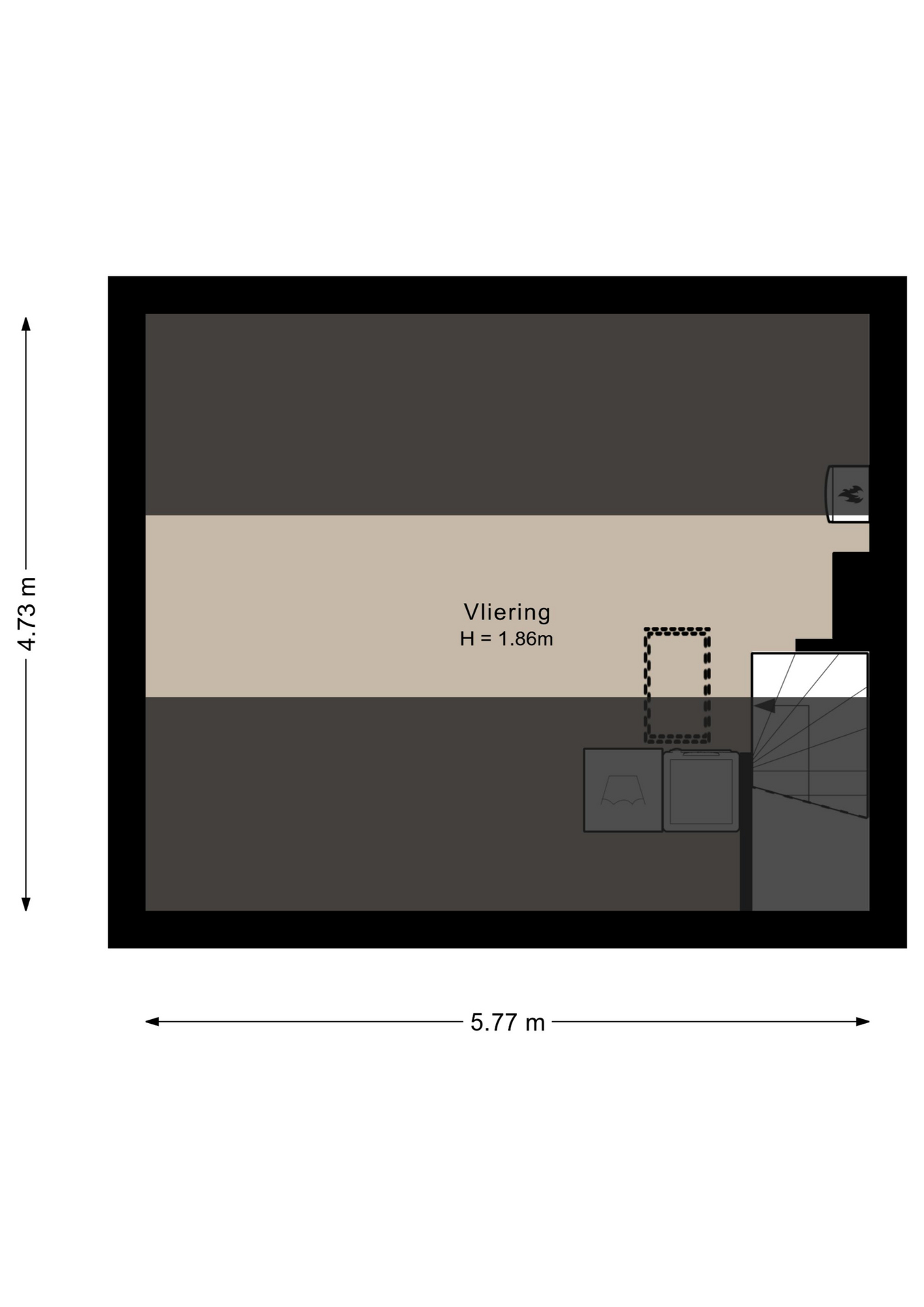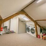 Via een vaste trap bereik je de tweede verdieping. Deze ruimte is volledig geïsoleerd en gestukt. Hier bevinden zich ook de aansluitingen voor de wasmachine en droger. Ideaal als werkruimte, logeerkamer of hobbyruimte.
