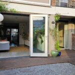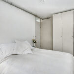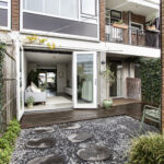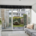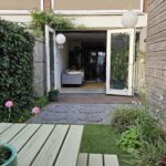 Aan de linkerkant ligt een compacte slaapkamer van 6 m², geschikt als werk-, logeer- of babykamer. Verderop bevindt zich de badkamer, eveneens vernieuwd in 2018. Deze is voorzien van een ruime inloopdouche, een wastafelmeubel, een designradiator en een toilet. Naast de badkamer vind je een aparte ruimte met aansluitingen voor de wasmachine, droger en de cv-ketel. De woonkeuken sluit aan op de lichte woonkamer, van waaruit je toegang hebt tot de ruime masterbedroom van 12 m². Deze kamer biedt voldoende ruimte en heeft directe toegang tot de achtertuin. De woonkamer heeft dubbele openslaande deuren naar de zonnige tuin op het zuiden/westen. Hier kun je heerlijk tot in de late uurtjes van de zon genieten en buiten zitten. Via een houten hek bereik je de gedeelde berging op het binnenterrein. Je hebt hier twee eigen fietsplekken en extra opbergruimte. Vanuit de tuin loop je bovendien direct de gezamenlijke binnentuin in.