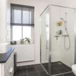 De badkamer is eveneens ruim van afmeting en voorzien van een douche met thermostaatkraan, hangend closet, wastafel met bijbehorend meubel en automatische mechanische ventilatie.