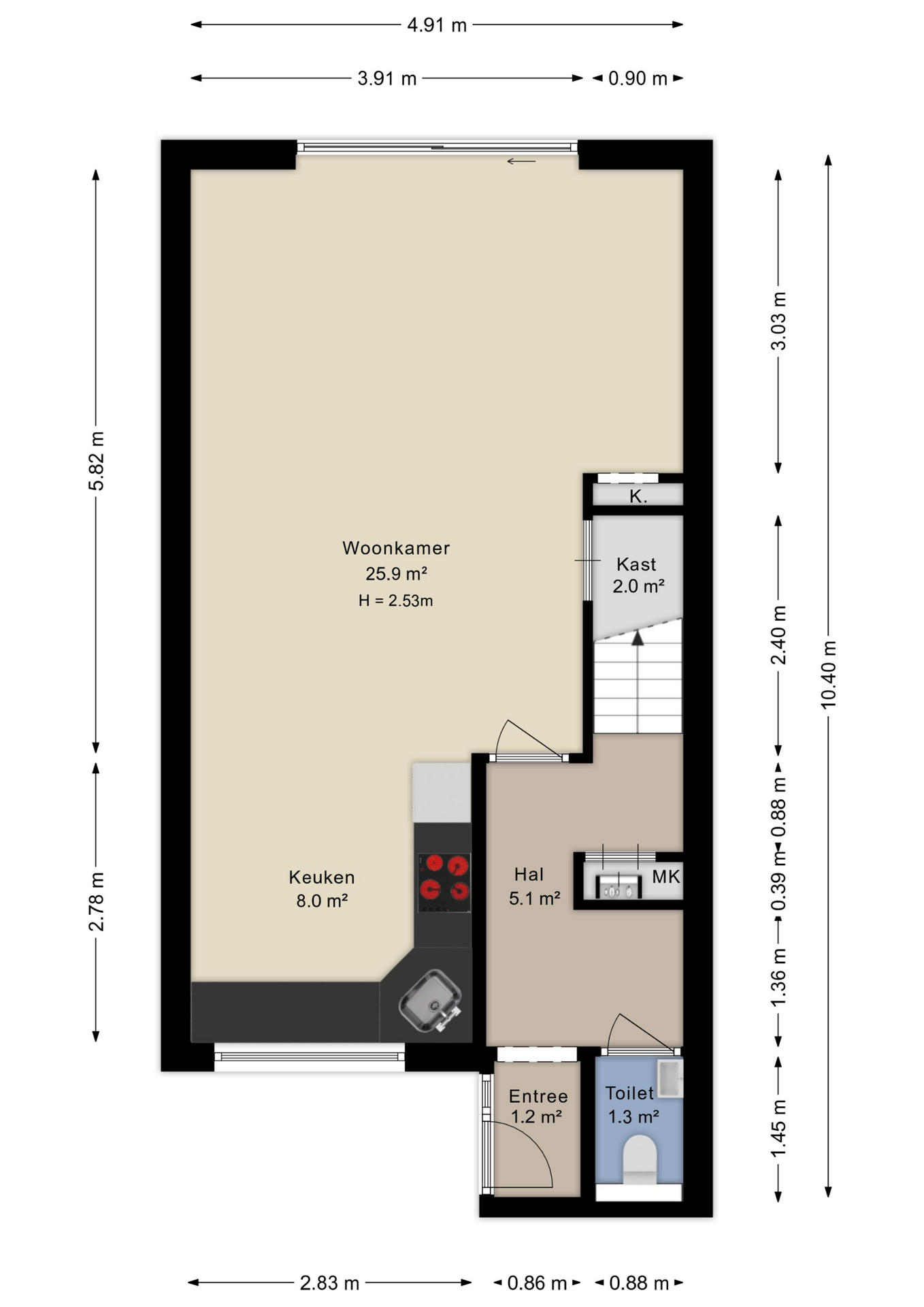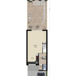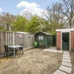 Op de begane grond kom je binnen in een ruime hal die toegang biedt tot zowel een toilet als een trapkast. De lichte woonkamer vormt samen met de inbouwkeuken een open ruimte waar koken en ontspanning hand in hand gaan. Via schuifdeuren bereik je de tuin met stenen bestrating en een houten berging, ideaal voor het opbergen van fietsen, tuingereedschap of andere spullen.
