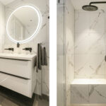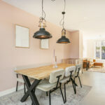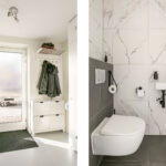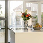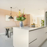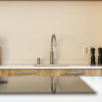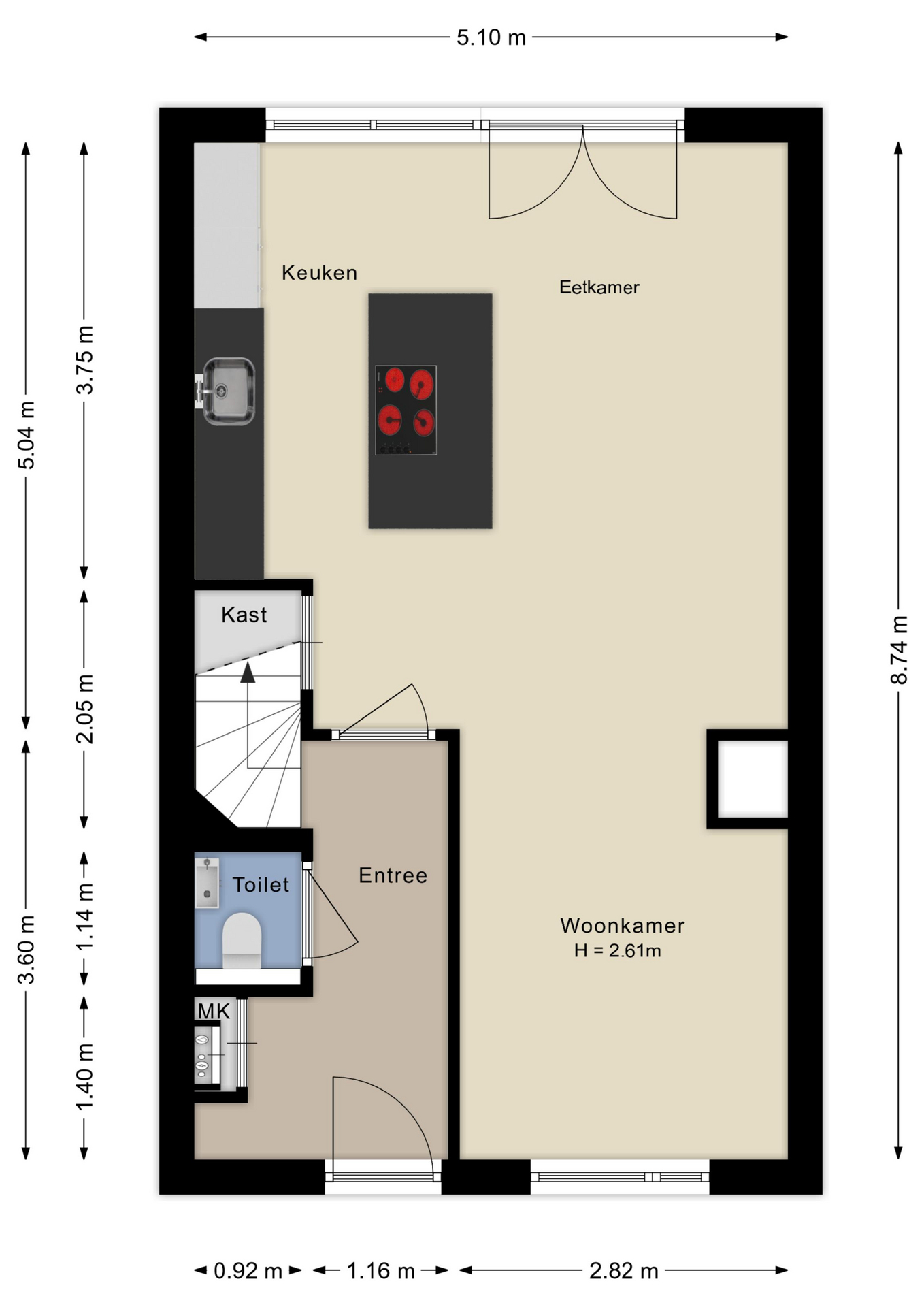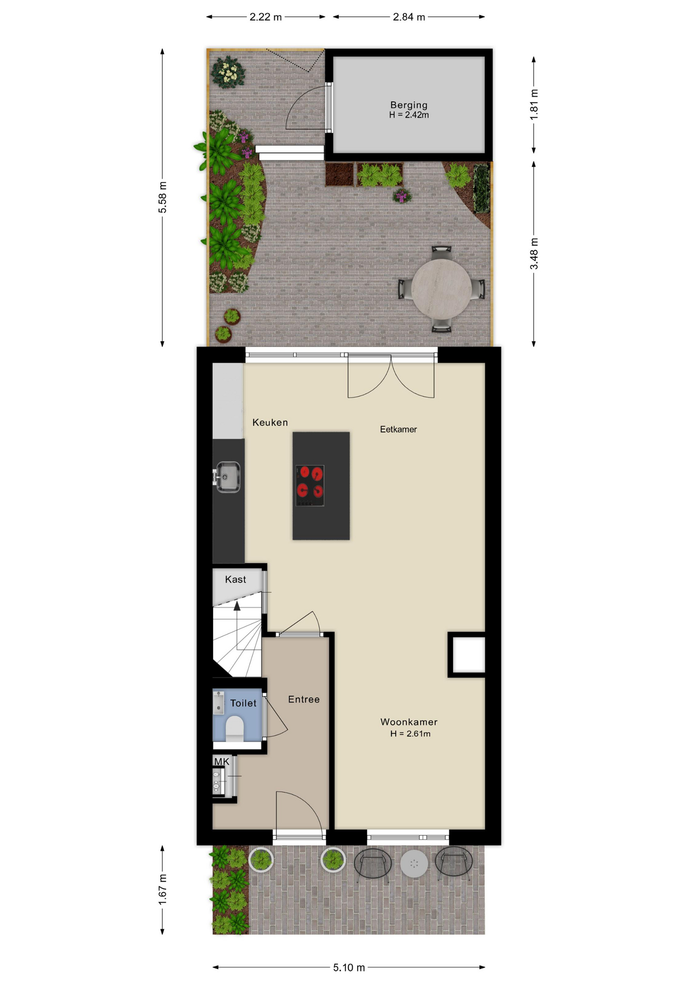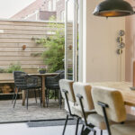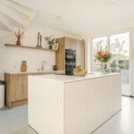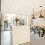 De begane grond is afgewerkt met een vloer van beton ciré, wat warmte en karakter toevoegt aan de moderne inrichting. Aan de achterzijde bevindt zich de luxe keuken met kookeiland, een echte eyecatcher voorzien van hoogwaardige apparatuur: een Quooker met bruiswaterfunctie, vaatwasser, koelkast, combi-magnetronoven, stoomoven en een Bora-kookplaat met downdraft. Dankzij het royale werkblad is dit een keuken waar koken een waar plezier wordt: strak, praktisch en modern. Aan de achterzijde is er ook ruimte voor een ruime eethoek met uitzicht op de tuin, terwijl de gezellige zithoek zich aan de voorzijde bevindt. In de hal vind je het modern afgewerkte toilet, de meterkast en de trapopgang.